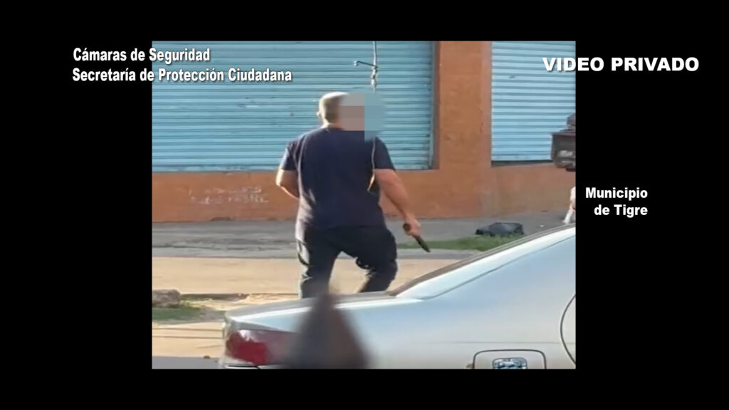 En las imágenes se ve al individuo efectuando varias detonaciones hasta que una de ellas impactó en la pierna del vecino. Tras cometer el hecho, el sujeto escapó raudamente en su camioneta.